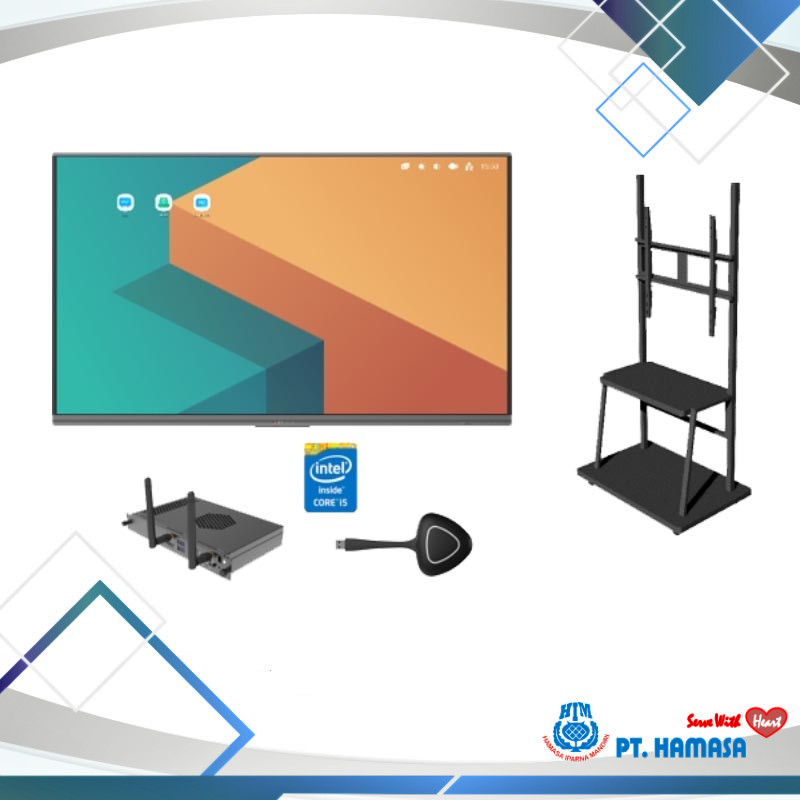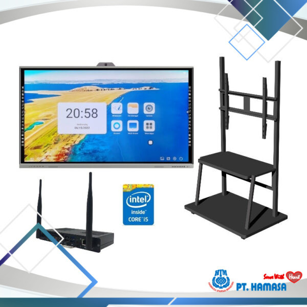 Display : ICE Board E2 Series 86 Inch Ultra Fine Infrared Flat Panel 4K UHD @60HZ Ultra Narrow Frame Support 40 Points touch & 20 Point Writing Product Size: 1968(L) x 1201(H) x 149,3(D) mm Display Size: 1895.4 x 1065.52 (mm) Nett Weight: 78kg Gross Weight: 102kg Brightness: 500 Nits Aspect Ratio: 16:9 Power Consumption: 450 W Version : Android 11 CPU: Amlogic T982, Cortex A55*4 1,9GHz RAM: DDR4 8G, ROM: 64GB Ethernet: 100Mbps in Android, 1000Mbps in OPS Wifi:IEEE 802.11a/b/g/n/ac (2.4GHz+5GHz) Bluetooth: 5.1 Special Port: 1* DP IN/ 2* Type C/ 1* HDMI Out With 18 Hotkeys Button USB 3.0 Type-A*3 (PC Following) Single Touch:<5ms Dual Touch:<7mm With Camera Module, Wall Bracket, 2 Stylus Pens Bytello Share Software for Mirroring Device from Laptop / Mobile Phone Include : - 13MP webcam with AI Function - OPS : 8-256 OPS PC Module Intel i7 80 PIN for ESeries (OPT-IFP-005)